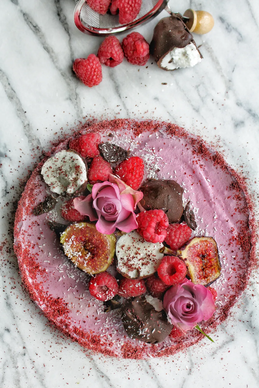 - Bestrooi de rand van de taart royaal met cranberry poeder en garneer naar wens.